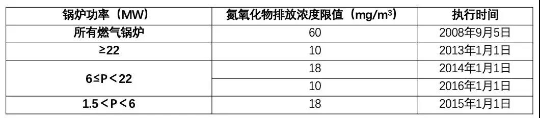 天津市2016年7月發(fā)布新標(biāo)準(zhǔn)DB12/151-2016《天津市鍋爐大氣污染物排放標(biāo)準(zhǔn)》,重新限定了燃?xì)忮仩t氮氧化物排放限值,新建燃油、燃?xì)忮仩t氮氧化物排放控制水平要求達(dá)到80mg/m3,具體氮氧化物的排放濃度要求見表7~8: